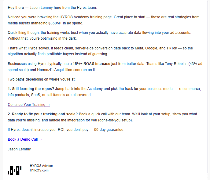 Hyros has had a massive impact when tracking and optimizing ads for peak revenue. Crunching the data of our 100k+ active education businesses almost all of the ones doing >7-figures per month in revenue swear by Hyros. Not using it is leaving tons of growth, scale, and revenue on the table.