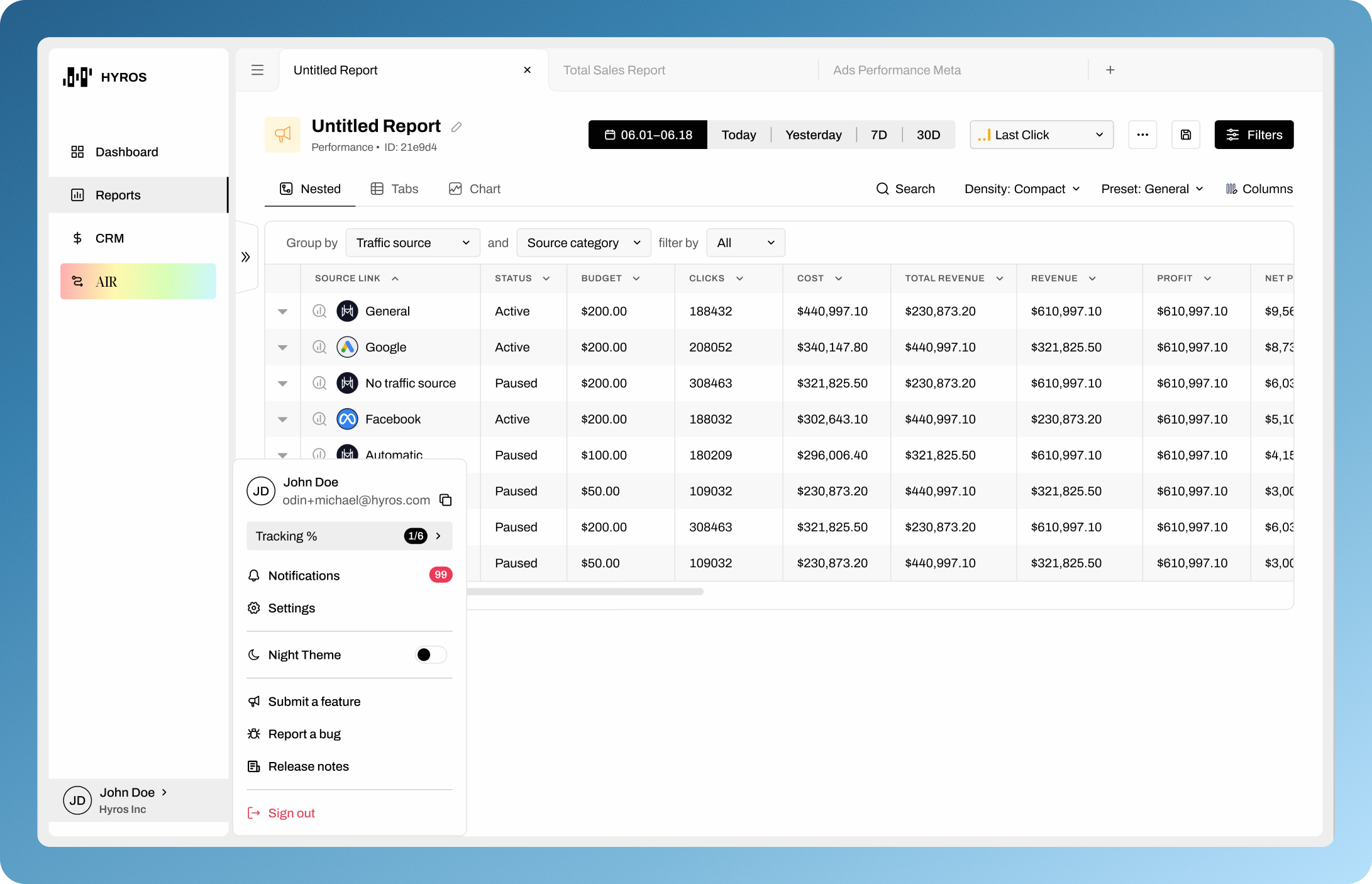 This makes Hyros feel more like a modern data workspace—perfect for marketers and analysts who need to compare reports, test attribution models, and explore multiple data views at the same time.