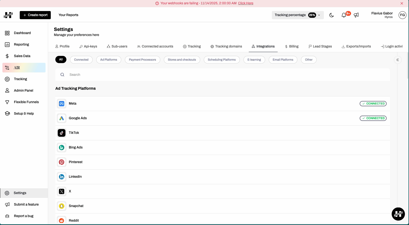Lead syncing – contacts and status updates flow into Hyros automatically.